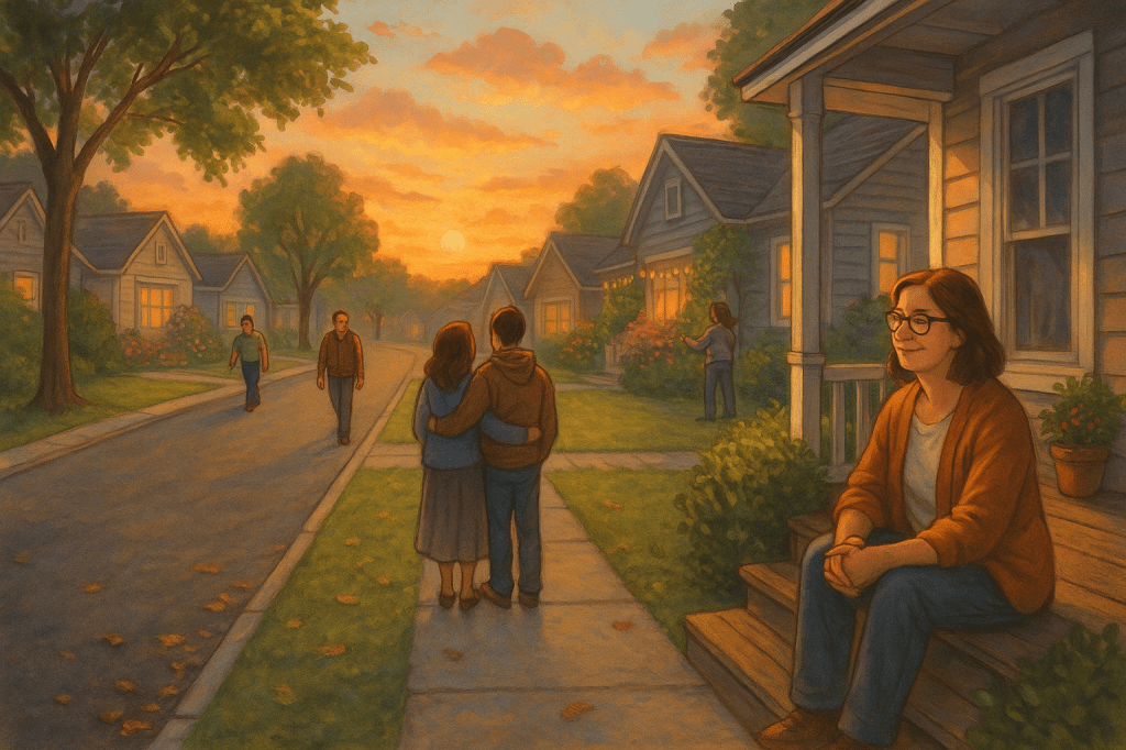 And if you catch her outside at twilight, when the lights start to blink on one by one, you might see something else too, that soft look people get when they’re remembering something good. Maybe the lights help her keep the memories close. Maybe they are the memories, shining just long enough to make the present feel safe again. Whatever it is, Maizie’s house hums with the kind of warmth that makes strangers slow their cars just to smile.