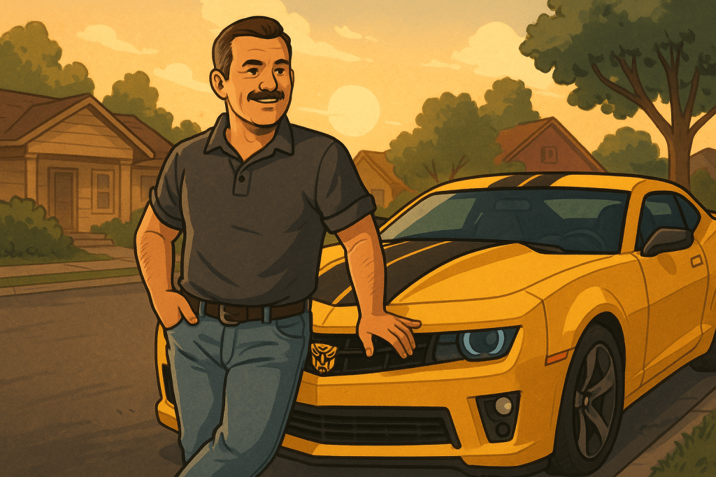 And then there’s Marco, the kind of man who doesn’t just live in the neighborhood; he elevates it by existing. His car is a dead ringer for Bumblebee from Transformers, same year, same shine, same this might secretly be sentient energy. Every kid’s jaw drops when he drives by, and every adult works very hard to pretend theirs didn’t. Because come on, who among us doesn’t scan the sky for a Decepticon when that thing turns the corner?