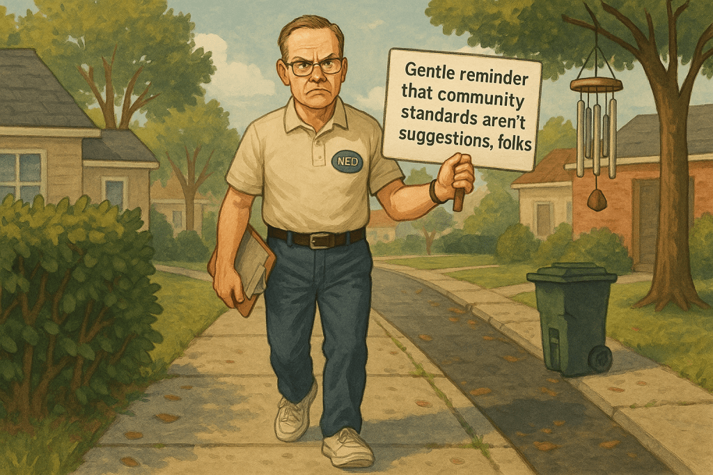 First there’s NextDoor Ned. Every neighborhood has one: the person who treats the street like their personal kingdom of order. NextDoor Ned didn’t so much grow up as he just kept his Hall-Monitor badge on in spirit. His legend began in fifth grade, one glorious week when he got to carry the clipboard and tell other kids to walk, not run. His mother told him he had a natural sense of leadership, and that sentence rewired his life.
