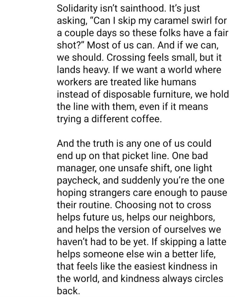 And in the grand scheme of life, skipping Starbucks for a few days is the smallest possible inconvenience. If that feels unbearable, I promise the issue isn’t the strike.